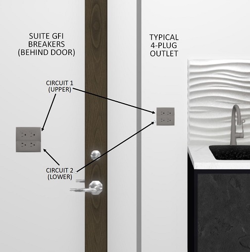 Mỗi phòng có 2 ổ cắm điện và phòng đôi có 3 ổ cắm điện và có bộ phận GFI được đặt sau cánh cửa để bảo vệ sự an toàn khi làm vịệc gần nước. Những ổ cắm điện được đặt phía trên và dưới để dễ dàng xử dụng các thiết bị.